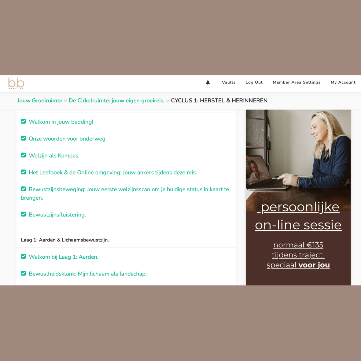 Je ontvangt dadelijk alles in de online omgeving: De Cirkelruimte. Zo heb je het volledige e-Leefboek Cyclus 1: Herstel & Herinneren, met korte theorie, oefeningen, rituelen en reflecties. Daarnaast krijg je toegang tot ondersteunend materiaal en video begeleiding die je helpt om dit niet alleen te lezen, maar echt te beleven en te integreren in je dagelijks leven. Je behoudt toegang tot de online omgeving voor één jaar.